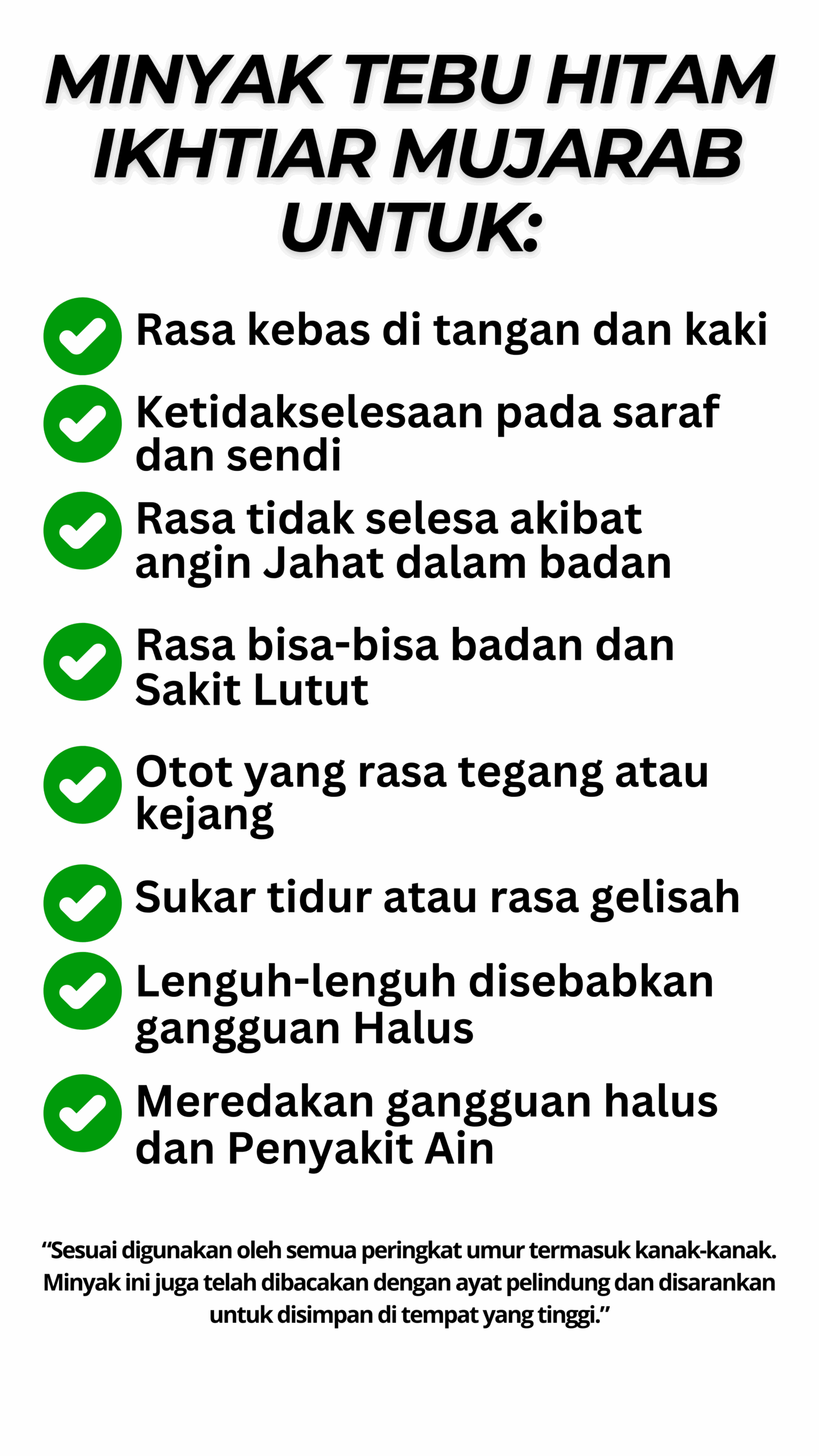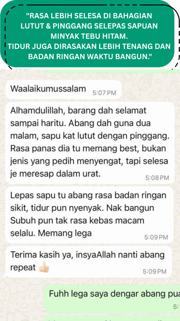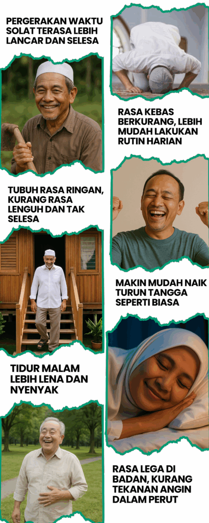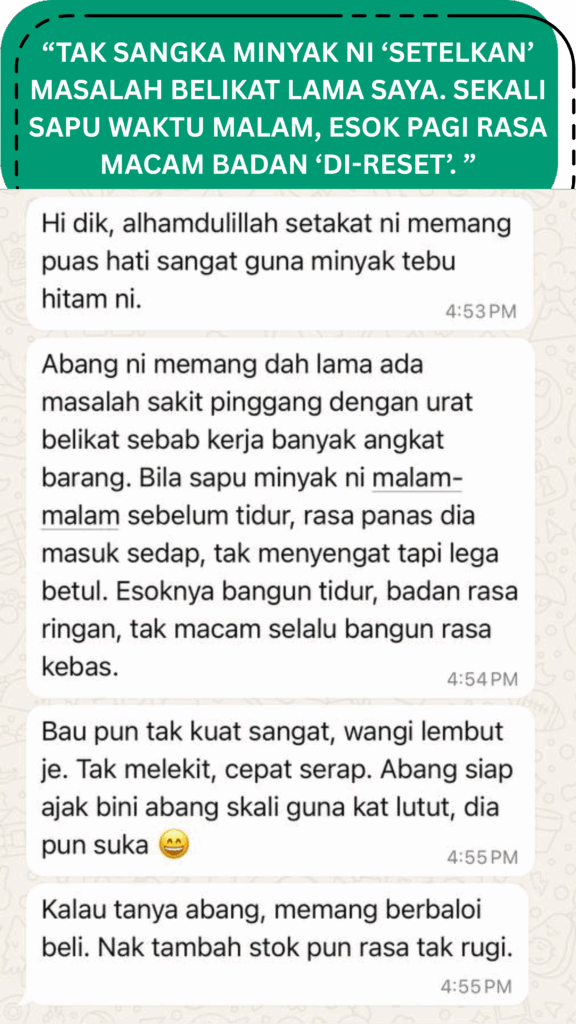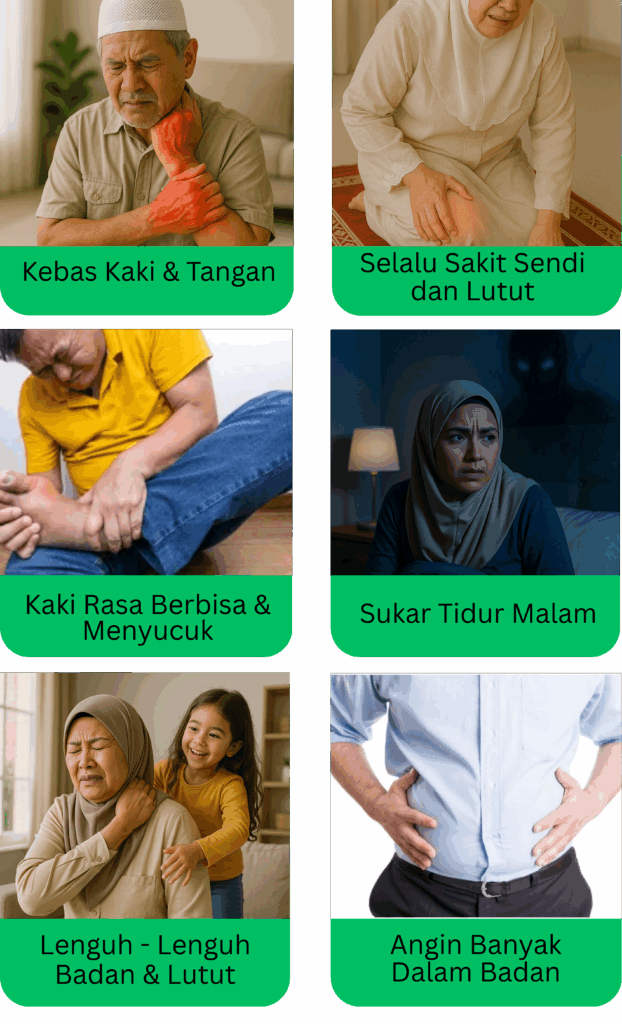 Minyak ini sesuai digunakan oleh mereka yang sering rasa tak selesa di bahagian kaki, sendi, atau tubuh — terutamanya golongan dewasa dan warga emas.