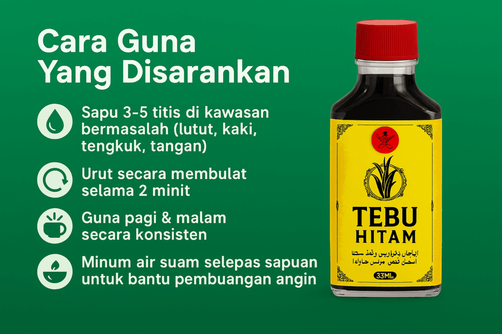 Hanya sapukan sedikit minyak di bahagian yang ingin diikhtiarkan seperti lutut, betis, atau tapak kaki. Guna 2-3 kali sehari, secara konsisten.