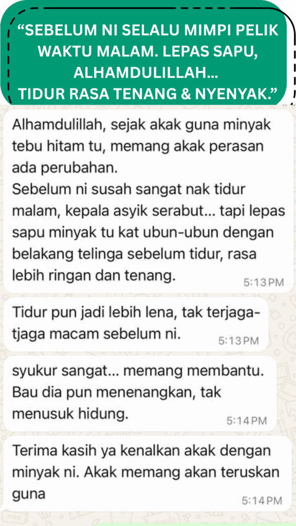 Ramai pengguna berkongsi rasa lebih tenang dan mudah tidur selepas sapu minyak sebelum tidur — tapi kesan berbeza ikut individu.